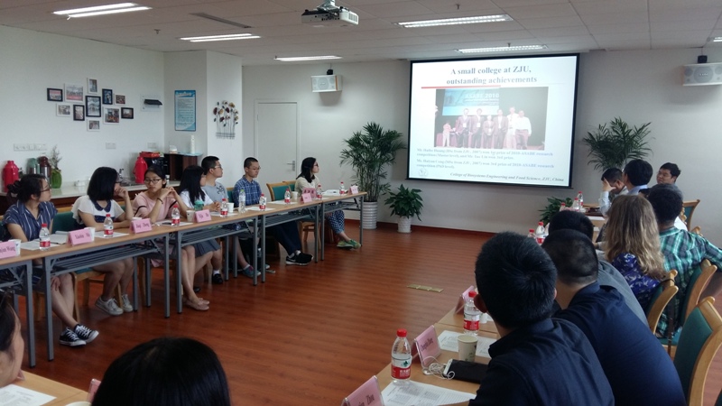 5月25日上午,学院师生交流吧气氛热烈。美国伊利诺大学(UIUC)学生交流团来学院交流访问欢迎交流会正在这里举行。浙江大学校友、伊利诺大学农业与生物工程系王新雷(Xinlei Wang)教授率领美国伊利诺大学(UIUC)2016年暑期学生交流团一行8人来bat365正版唯一官网进行为期五周的暑期交流学习。学院院长朱松明、副院长蒋煥煜,院长助理刘东红,农业信息技术研究所副所长盛奎川,即将接受UIUC学生交流团实验室交流及已经访问或即将访问UIUC的bat365正版唯一官网研究生、本科生出席了欢迎交流会。