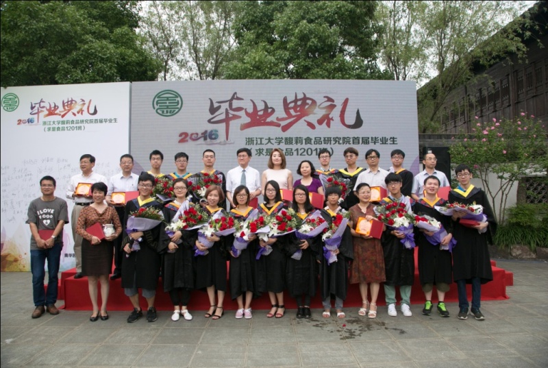 2016年6月18日上午, 浙江大学馥莉食品研究院在紫金港校区南华园举行了别开生面的首届毕业生(求是食品1201班)毕业典礼。副校长任少波,宏胜饮料集团总裁宗馥莉,竺可桢学院副院长唐晓武、党委副书记钟蓉戎,校发展联络办副主任、教育基金会副秘书长顾玉林,生工食品学院党委书记楼锡锦、副院长叶兴乾,馥莉食品研究院院长刘东红,馥莉食品研究院各任课老师、学生导师、班主任,以及2012-2015期求是食品馥莉班全体同学与部分毕业班同学家长出席毕业典礼。典礼由毕业班学生马杰主持。