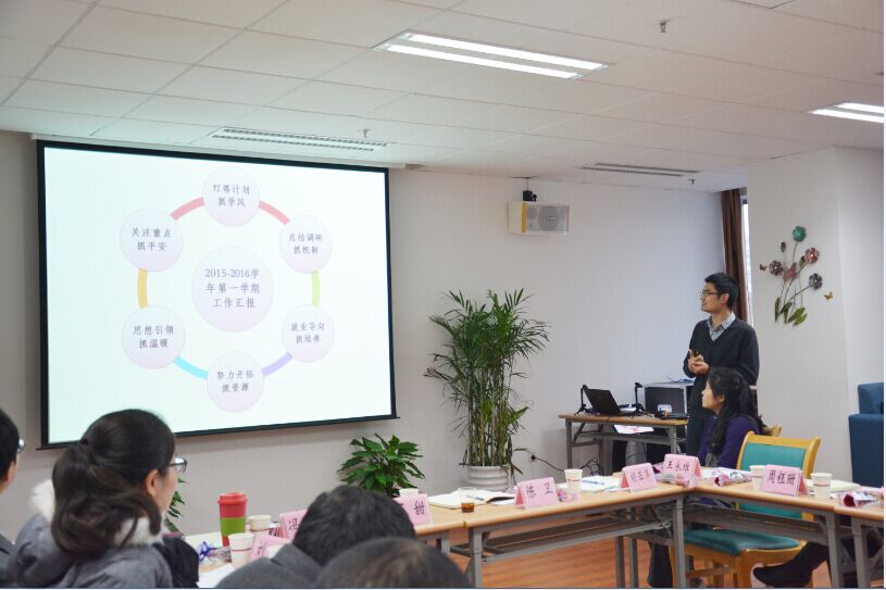 云峰学园辅导员周钰珊汇报了14级、15级学生在学园的表现和期末需要注意的事项。学院本科生辅导员张云飞从灯塔计划抓学风、总结调研抓机制、就业导向抓培养、努力开拓抓资源、思想引领抓温暖、关注重点抓平安六个方面向班主任简要汇报了一个学期的工作。