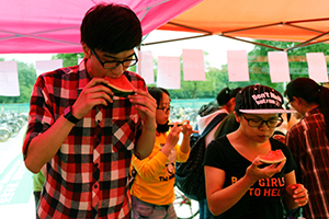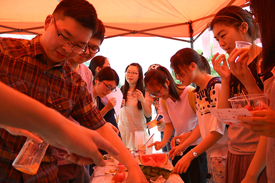 本次“食品嘉年华”由8个展位组成,每个展位都将美食和游戏巧妙结合,为同学们传递食品科普知识的同时呈现食品领域的先进技术。“水果冰DIY”、“沙拉制作”等游戏为吃货们呈上满满福利。据说崂山白花蛇草水、黑松沙土、红色尖叫、格瓦斯、东方树叶位列中国最难喝饮料TOP5,同学们纷纷在“巧舌能辩”中过关斩将。只有玩过“蒙眼喂食”才知道吃西瓜可没有这么简单。还有传说中的“吃西瓜大赛”,小伙伴们纷纷拉着身边好友前来体验。