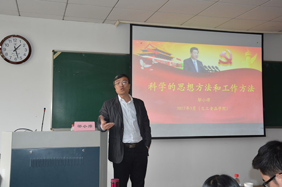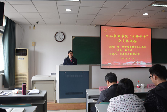 3月31日下午,生工食品学院在西2-313举行“先锋学子”2017年第一次全员培训会。教育部2015年“思想政治教育中青年杰出人才支持计划”获得者、党委学生工作部部长、求是学院党委书记、本科生院副院长邬小撑老师受邀为全体学生党员做“科学的思想方法和工作方法”专题报告。培训会由学院党委副书记陈素珊老师主持。
