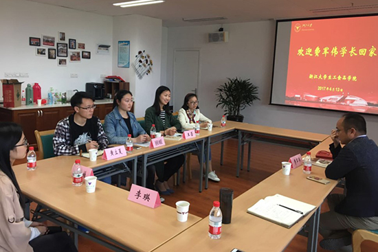 浙江大学120周年校庆和生工食品学院60周年院庆即将到来之际,06届本科毕业生费军伟校友于4月13日受邀返校座谈,与在校学生交流求学经历和职场感悟。座谈会由本科生辅导员张云飞主持,参与交流的学生代表有王蕾、顾頔、黄立夏、方媛媛、张欢欢等同学。