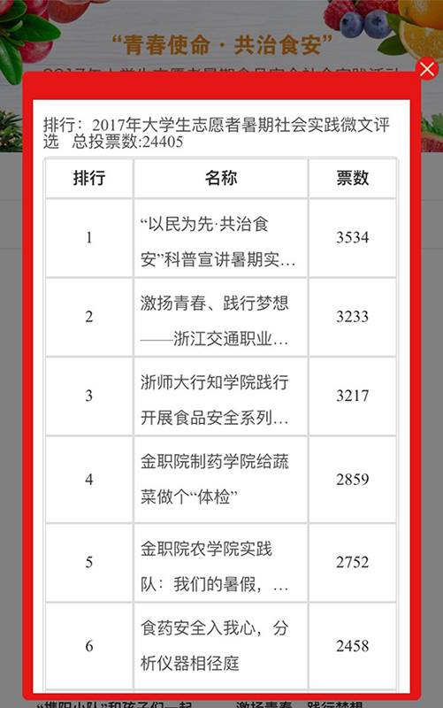 本次公众投票评选活动将网络与食品安全科普紧密结合,包括浙江大学、浙江工业大学、浙江工商大学等在内的27所省内高校大学生志愿者暑期实践团队入围“浙江食品药品监管”官方微信平台投票环节,活动自8月7日正式进入票选环节,受到了广大高校师生和社会公众的高度关注。随着时间的推移,许多社会人士及高校学生通过微信等社交平台广泛转发比赛信息。bat365正版唯一官网“以民为先,共治食安”科普宣讲暑期实践团队,在浙大师生、众多校友和社会人士的支持下,最终以绝对优势胜出,为在最终全省“‘青春使命,共治食安’2017大学生志愿者暑期社会实践”活动评选中取得好成绩奠定了扎实基础。