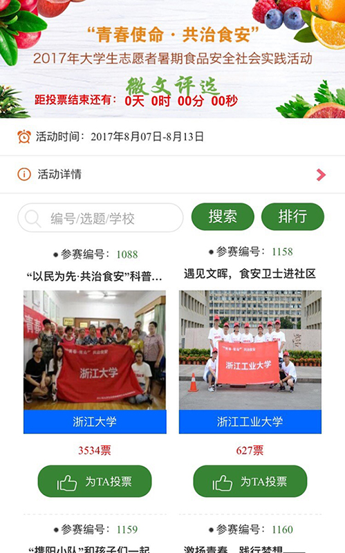 8月13日晚,由浙江省食安办、食品药品监督管理局、团省委、省学联联合主办的“青春使命,共治食安”2017大学生志愿者暑期社会实践微文创作大赛,经过惊心动魄的网络投票角逐,评选结果最终揭晓:bat365正版唯一官网的“以民为先,共治食安”科普宣讲暑期实践团队以3534票位居第一。