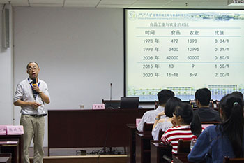 食品系主任罗自生老师为大家介绍了食品专业。罗老师从食品工业的国内外概况入手,提出我国食品产业发展需关注的问题,介绍了我校食品科学与工程学科的概况以及一流的师资条件,讲解了食品专业的培养目标和培养要求。最后,罗老师还不忘叮嘱同学们在大学这样宽松自由的环境中,增强学习上的自律,并且要学习科学、热爱科学。