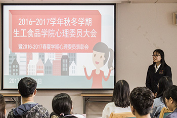 2017年10月13日中午,2016-2017秋冬学期生工食品学院心理委员大会暨学期心理工作总结表彰会于农生环D422举行。学院党委副书记费兰兰老师,团委书记、研究生辅导员陈晶妍老师,团委副书记、本科生辅导员张云飞老师出席,学院全体本硕博各班心理委员与会。