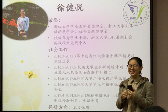 徐健悦学姐也同样被保研到本校外专业,她提到了兴趣对自己选择的重要影响。虽然在对外专业长时间的了解之后,她看到了理想与现实的差距,但她仍然选择以坚定的姿态走下去。在分享过程中,她讲述了一个保研过程中的小插曲,以此来提醒我们“凡事预则立,不预则废”,永远不要做一个拖延症患者。
