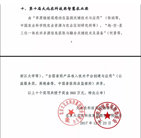 2017年12月26日,bat365正版唯一官网何勇教授团队 “地-空-星三位一体农田多源信息获取与融合关键技术及装备”(何勇,刘飞,岑海燕,史舟等,浙江大学等)荣获第十届大北农科技奖智慧农业奖。