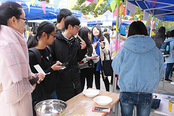 食品加热时的浓郁香味吸引着人流。虽然已入冬,三家社团以及前来品尝美食的师生无不荡漾出幸福的笑容。不同摊位在社团干事灵巧的双手下为同学们呈现出不同的美食,入口即化的糕点、酸辣爽口的凉皮、暖心香甜的西米,吸引着文广往来的师生驻足流连,一时间热闹非凡,活动现场洋溢着品尝美食的欢乐和赞不绝口的满足。部分食品制作周期较长,但参与者兴趣依旧,不断询问制作流程和所取原料,换取食品后,纷纷拍照留念。活动现场人声鼎沸但秩序井然。