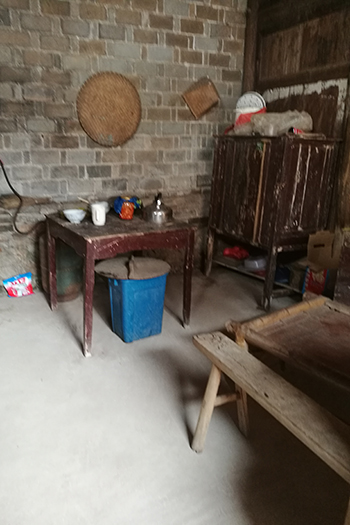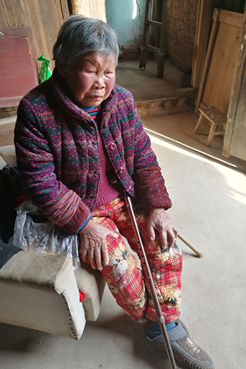 交谈中,我了解到,何奶奶年前出门时不小心跌进了屋檐下的小水沟,进了医院拍片子,至今仍未好转,每天还需要拄着拐杖勉强走路。从家中摆设可以看出,何奶奶家中简朴,以前还可以自己烧饭煮菜,现在因为腿伤还需要儿子每天前来做饭。奶奶现在还患有脑梗、糖尿病等疾病,所幸其血脂不高,但日常也只吃一些红薯作物。谈到子女,何奶奶兴奋起来,开始聊起以前的事,她不由感叹起自己跟家中姐姐是全村人的骄傲。接着,她又说现在子女都孝顺,生病时儿子愿意悉心照顾自己、陪伴自己,让她感觉很欣慰。