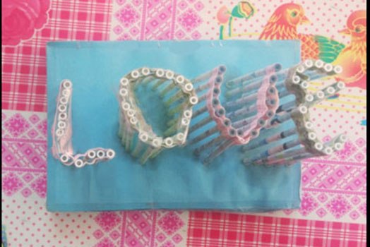 第二次,在前往雪儿家途中,我带上了一张卡纸和高三时用过的空笔芯。雪儿曾说她一直想给妈妈做个礼物,因为笔芯不够,就没有实施。在我到达她家后,雪儿便用笔芯和卡纸做了一份礼物送给了妈妈,一个大大的“LOVE”。尽管礼物并不精致,但当她将礼物送给妈妈,用稚嫩的声音说出“妈妈我爱你”几个字的时候,依旧让人鼻子一酸。