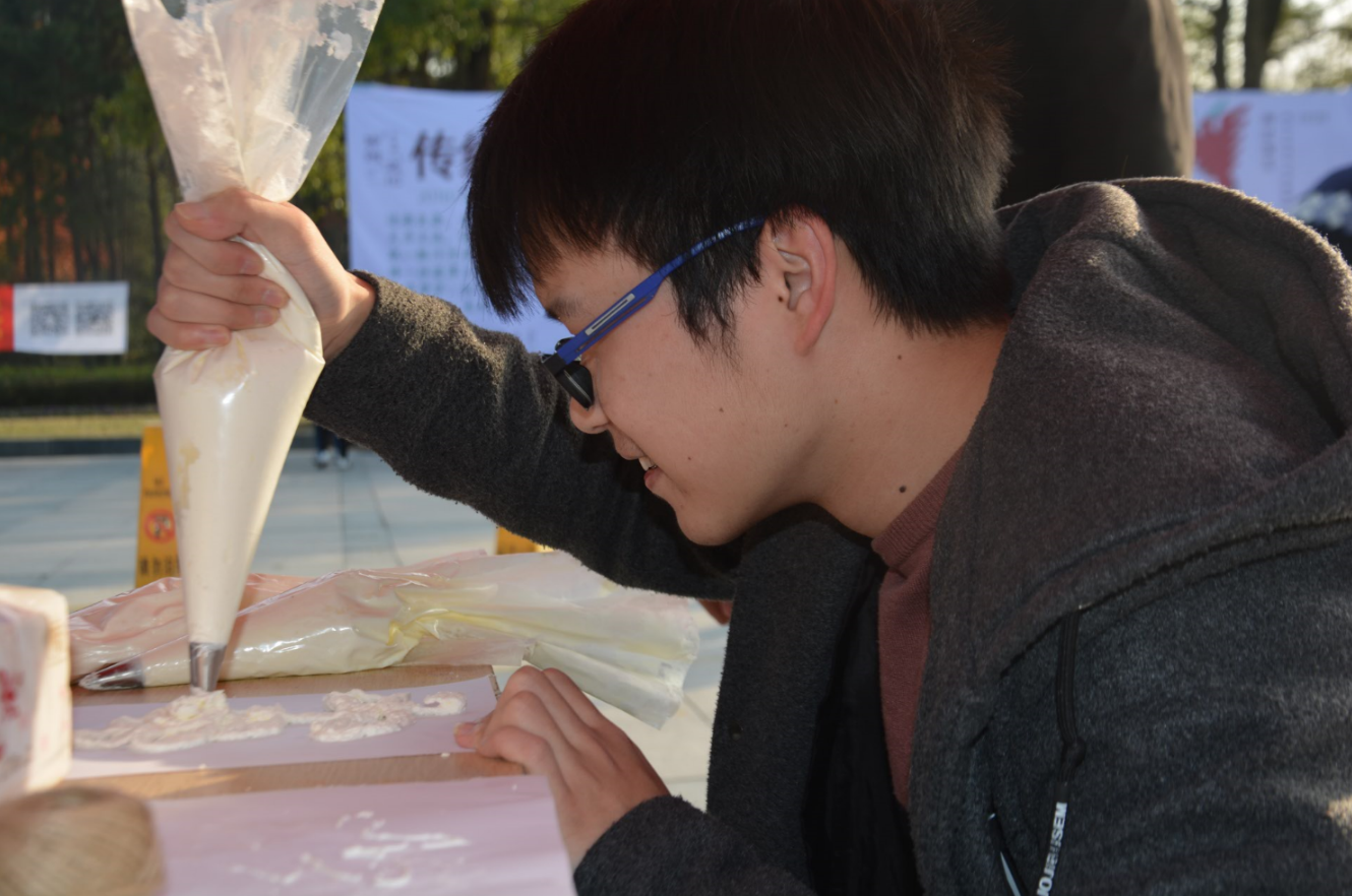 除此之外还有“乒乓球大冒险”活动,考验同学们的协调能力,惊险刺激的程度不亚于“套套套大富翁”。还有“菜品起源地”游戏,参加的同学必须准确说出菜品最早来源于哪里。这是对同学们的知识储备的一大挑战,在公布答案后,有不少同学惊呼:“涨知识了”。当然这一游戏也极大的促进了同学们对美食文化的了解。对食物制作实际操作能力要求最高的就是“裱花”活动了。参与者要首先抽取三张裱花的图,判断是用哪一类型的裱花嘴所裱,选择一种将花形裱出。可以看出,平常热衷于西点制作的同学大有人在,一个个都有不俗的表现。当然,这一游戏也给了没有接触过裱花的同学一个实际操作的机会,体验了一把裱花的乐趣。