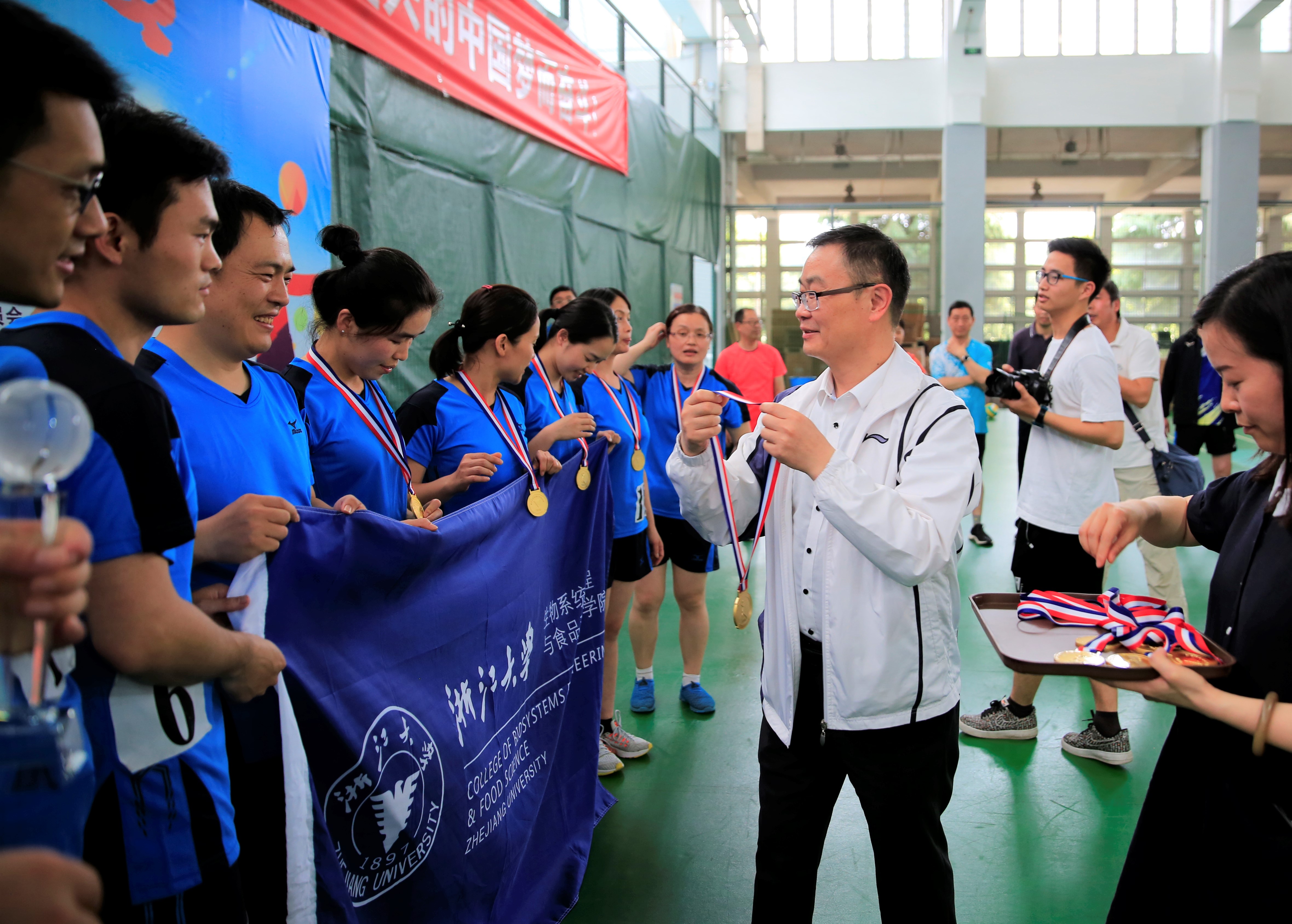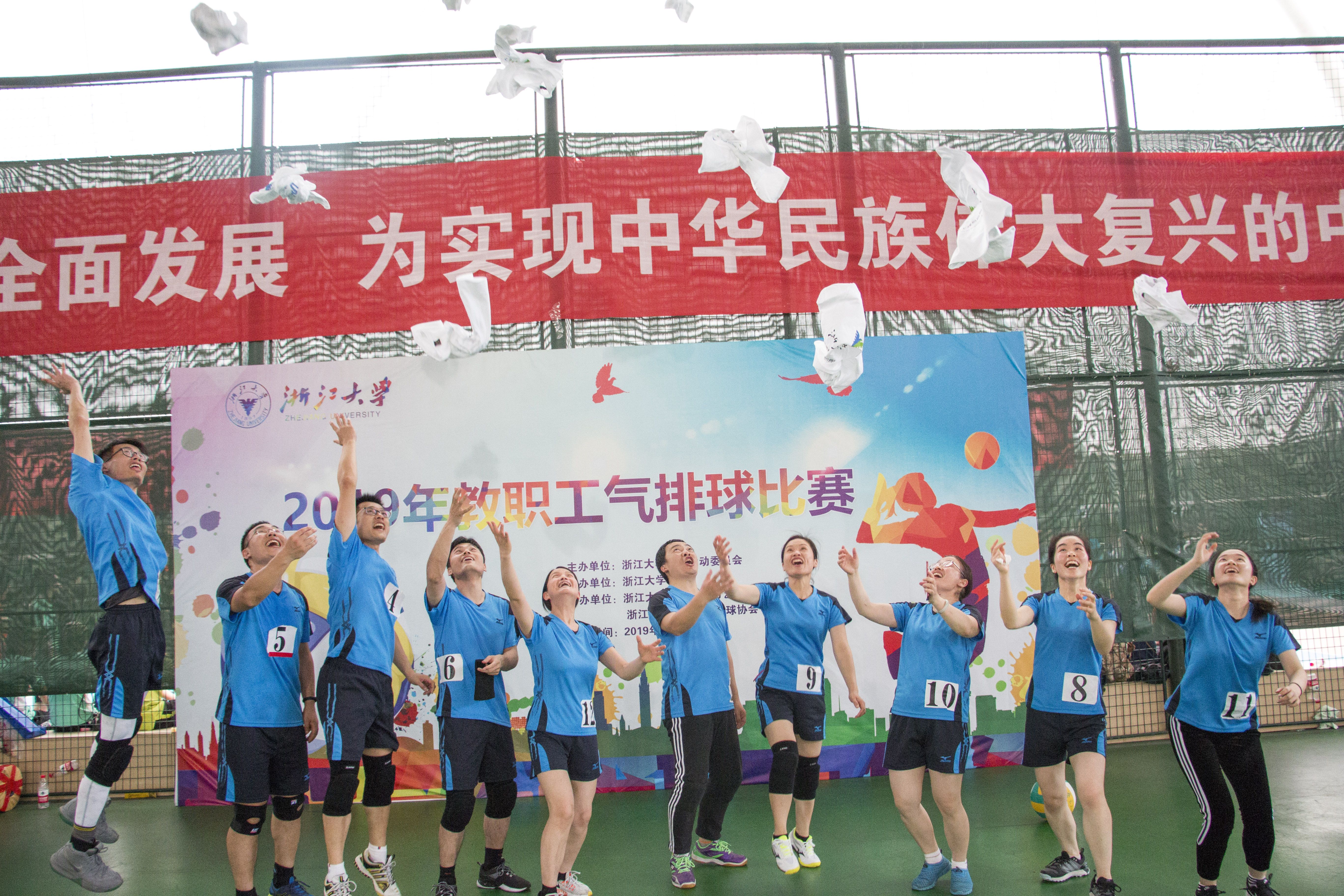 浙江大学2019年教职工气排球赛于5月11日至12日在紫金港校区风雨操场举行。在党委书记王晓燕老师的带领下,生工食品学院气排球队全体健儿经过一个多月的持续训练和周末两天的高强度比赛,践行“笃实、励新、兼容、康健”的院训精神,顽强拼搏,过关斩将,越战越勇,最后以8场全胜的战绩取得院系组第一名的佳绩,捧得浙江大学2019年教职工气排球赛冠军!此项殊荣也是近些年bat365正版唯一官网在学校教职工体育赛事上的最好成绩!
