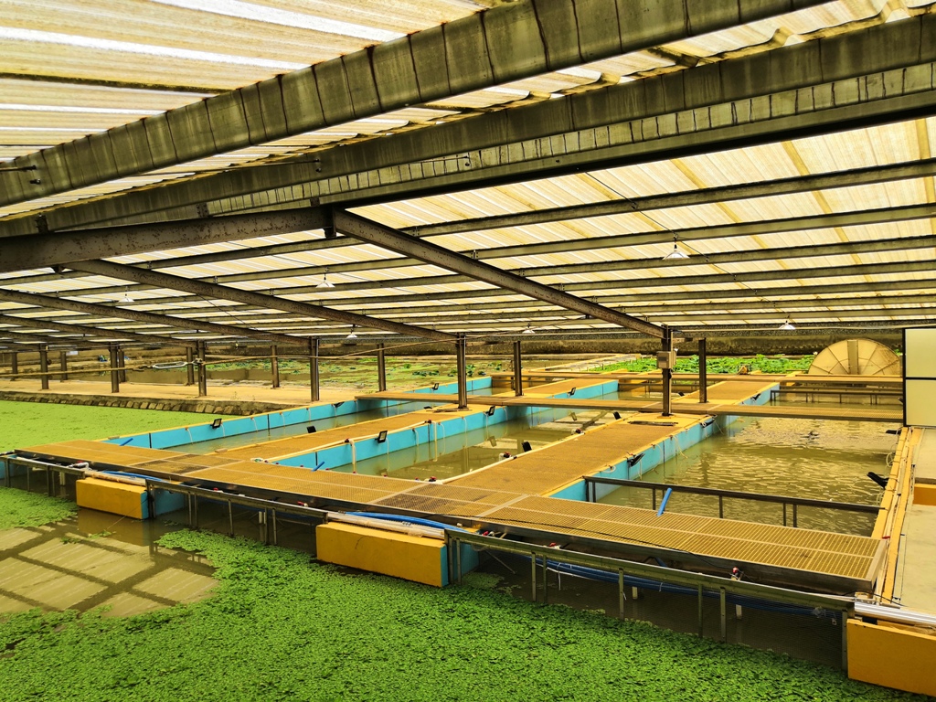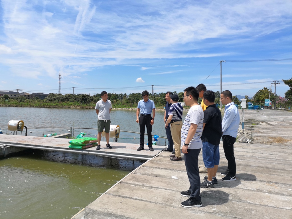 调研团一行来到余杭区杭州建丰农业开发有限公司(浙江省重点农业专项合作示范基地),参观了浙江大学提出的专利技术“三段式分级”养殖模式:工厂化循环水育苗系统、温室大棚池塘内循环流水标苗系统和池塘内循环流水养殖系统。