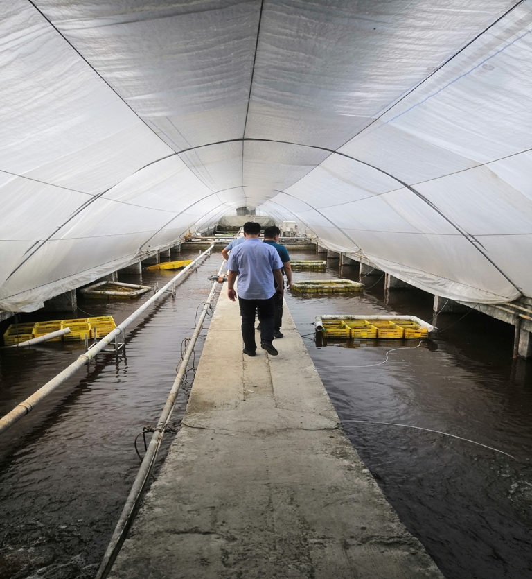 调研团一行来到余杭区杭州建丰农业开发有限公司(浙江省重点农业专项合作示范基地),参观了浙江大学提出的专利技术“三段式分级”养殖模式:工厂化循环水育苗系统、温室大棚池塘内循环流水标苗系统和池塘内循环流水养殖系统。