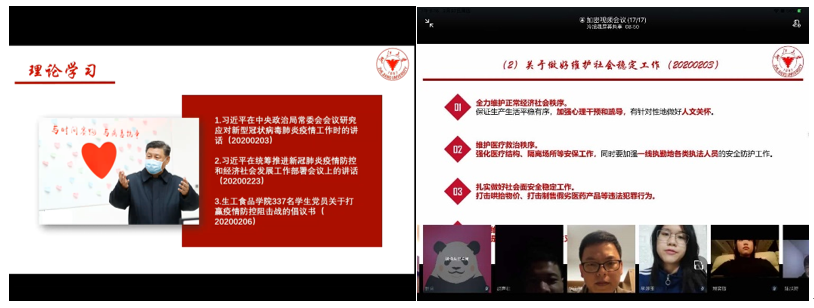 【序言】这是一个不平凡的春天,这是一个特殊的新学期。新型冠状肺炎病毒的席卷改变了每个人的生活节奏和社会步调,全民战“疫”已然打响。当前,疫情形势依然严峻复杂,防控正处在最吃劲的关键阶段。在疫情防控的关键时期,为学习贯彻好习近平总书记重要指示精神和党中央、教育部及学校关于疫情防控的工作部署,巩固“不忘初心、牢记使命”主题教育成果,明确“离校不离教、停课不停学”,生工食品学院各学生党支部积极响应号召,依托网络平台开展了线上党员大会。通过线上主题学习,强化广大学生党员在特殊时期的责任意识、担当意识、奉献意识,通过线上主题党日活动,密切学生党员的相互联系,增强战胜疫情的坚定信心和坚强决心,发挥好广大党员同志的先锋模范作用,以“咬定青山不放松”的韧劲、“不破楼兰终不还”的拼劲参与到战“疫”行动中,共同打赢全民疫情防控狙击战!今日推出生工系本科生党支部、农业生物环境工程研究所研究生党支部的组织生活剪影。