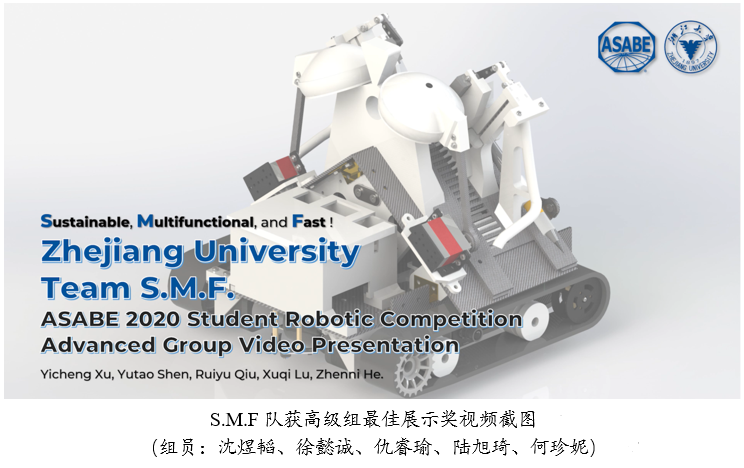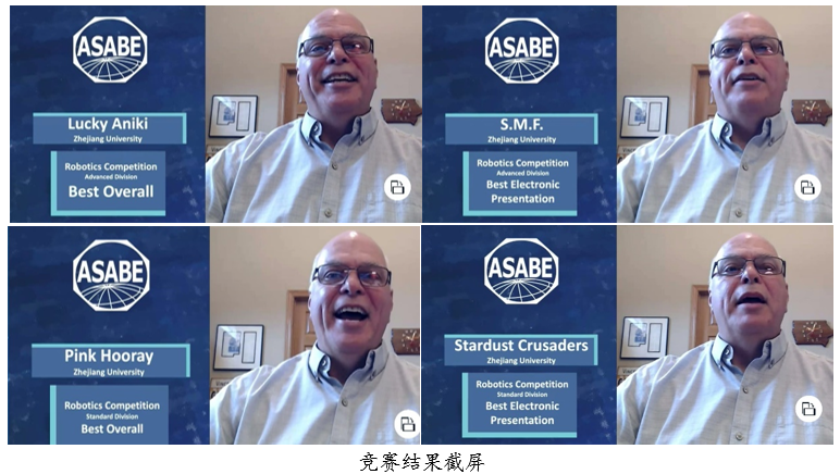 在2020美国农业与生物工程师协会(American Society of Agricultural & BiologicalEngineers, ASABE)年会第十四届国际大学生机器人设计竞赛(ASABE Robotics Competition)上,bat365正版唯一官网农业工程专业的四支本科生队伍分别获得本届国际竞赛的标准组(Standard Division)和高级组(Advanced Division)总体最佳奖(Best Overall)和最佳展示奖(Best Electronic Presentation)。