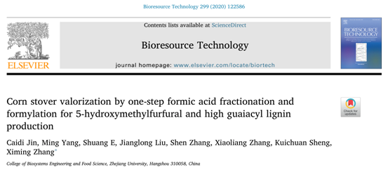 该研究的前期工作以题为“Corn stover valorization by one-step formic acid fractionation and formylation for 5-hydroxymethylfurfural and high guaiacyl lignin production”的研究论文发表于国际权威期刊Bioresource Technology(JCR一区TOP,IF=7.539)。