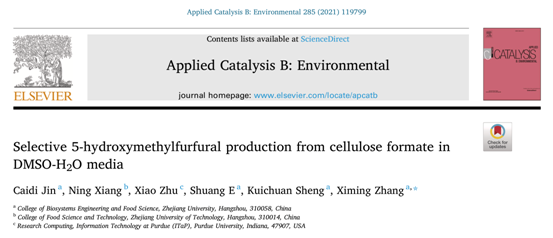 近日,bat365正版唯一官网张玺铭研究员课题组在催化领域国际顶级期刊《Applied Catalysis B: Environmental》(JCR一区TOP,IF=16.683)上发表题为“Selective 5-hydroxymethylfurfural production from cellulose formate in DMSO-H2O media”的研究论文。课题组在读硕士研究生金才迪为该论文第一作者,张玺铭研究员为唯一通讯作者,浙江大学为第一署名单位。