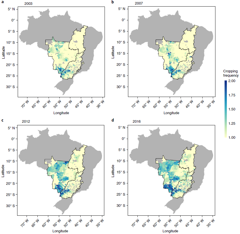 从1980年到2016年,巴西的大豆和玉米产量增长了四倍多(图2)。研究人员通过收集整理开放获取的相关统计数据(1980‒2016年玉米和大豆的县级单产、收获面积和总产量),量化分析了巴西在国家、区域和县三种空间尺度下双季种植和农田扩张两种策略对于大豆和玉米生产发挥的作用。在国家层面,农田扩张仍是主要的增长路径,尽管其贡献率逐年下降,在2016年仍贡献了65%的总面积增长;而双季种植的贡献率则逐年增加至35%。双季种植和农田扩张都显示出时空格局的差异和变化:在巴西南部的传统农业地区,双季种植占主导地位;在中西部和马托皮巴(东北部新兴农业区),农田扩张仍然是主导策略。在2003-2016年期间,巴西通过双季种植节省了约11.6亿亩的农田面积。巴西双季种植的时空变化量化分析研究为如何在已有耕地上提高粮食产量提供了一个新的角度和思路,对保障全球粮食安全和减轻土地负担起到重要参考作用。