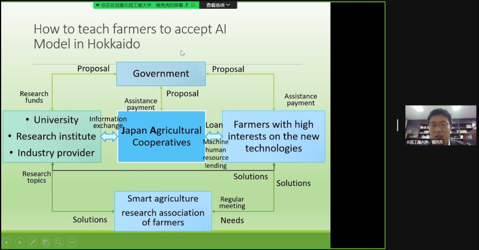 College of Biosystems Engineering and FoodScience host a series of online reports called "Digital Agriculture andFuture Food" to boost international communication. On 10th August 2021, Dr. Liangliang Yang, an assistant professor from the Laboratory ofBio-mechatronics, Kitami Institute of Technology, gave an academic reportentitled "AI Agriculture & Its Application in Northern Japan."