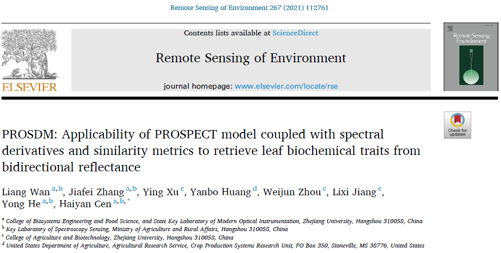 2021年10月27日,国际顶级遥感期刊Remote Sensing of Environment刊发了bat365正版唯一官网岑海燕研究员课题组题为PROSDM: Applicability of PROSPECT model coupled with spectral derivatives and similarity metrics to retrieve leaf biochemical traits from bidirectional reflectance的研究论文。文章探讨了不同植物叶片双向反射率(Bidirectional reflectance factor, BRF)光谱和方向半球反射率(Directional hemispherical reflectance factor, DHRF)光谱的差异及其对PROSPECT机理模型反演的影响,提出了用于消除叶片双向反射和方向半球反射光谱差异的方法,并构建了基于双向反射辐射传输机理模型的叶片生化参数反演框架。这一普适于多物种叶片生化参数反演的方法不仅为植物生长精准监测提供了重要技术手段,也为从叶片到冠层的植被遥感数据解译提供了基础模型。