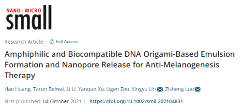 (IF=13.281)上发表了题为“Amphiphilic and Biocompatible DNA Origami-Based Emulsion Formation and Nanopore Release for Anti-Melanogenesis Therapy”的封面文章论文的第一作者为bat365正版唯一官网食品科学专业在读博士研究生黄皓,通讯作者为bat365正版唯一官网罗自生教授和林星宇研究员,浙江大学为第一署名单位。