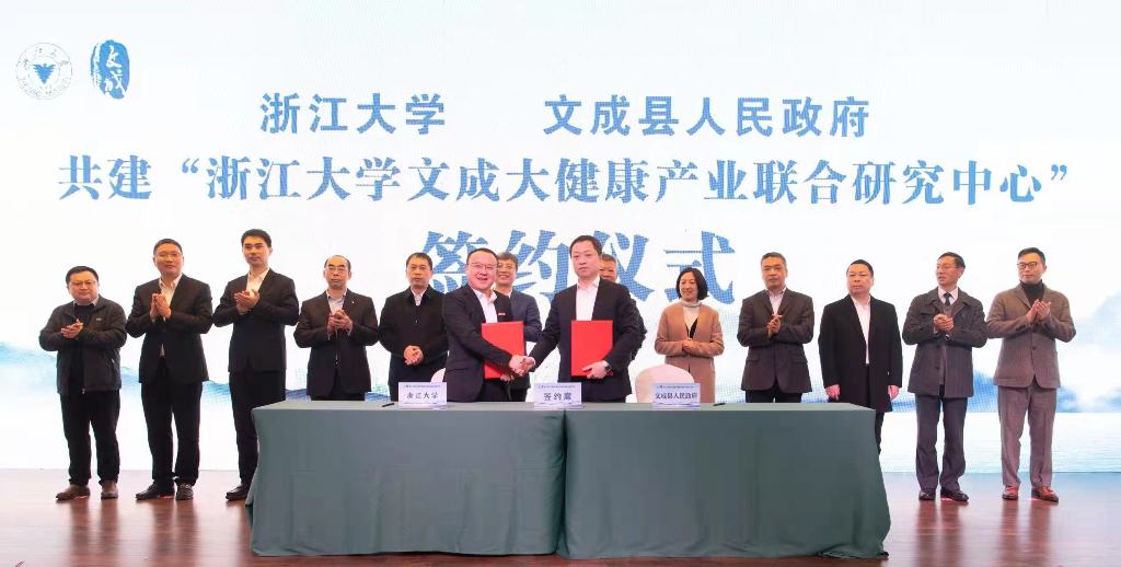 合作协议签署后,温州市副市长汪驰、浙江大学党委副书记邬小撑亲自为“浙江大学文成大健康产业联合研究中心”揭牌。