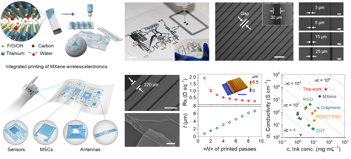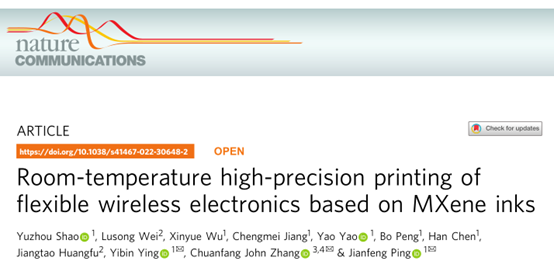 6月9日,bat365正版唯一官网平建峰、应义斌教授团队(IBE)联合浙江大学信息与电子工程学院和瑞士联邦材料科学与技术研究所的合作者在NATURE子刊(Nature Communications)上发表研究论文“Room-temperature high-precision printing offlexible wireless electronics based on MXene inks”(图1)。该研究报道了一种基于MXene水性墨汁的室温直接打印技术,可在多种柔性基底上实现无线可穿戴电子器件的直接适形打印,且无需印后退火等繁琐处理工序。