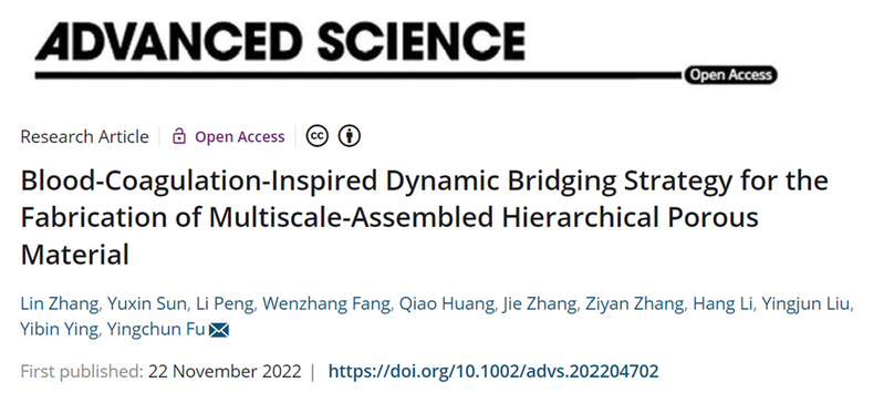 近日,bat365正版唯一官网傅迎春、应义斌教授团队(IBE)联合浙江大学高分子科学与工程学系的合作者在《先进科学》(Advanced Science)上发表研究论文“Blood-Coagulation-Inspired Dynamic Bridging Strategy for the Fabrication of Multiscale-Assembled Hierarchical Porous Material”(图1)。该研究针对目前农业传感器应用中对高效快速的目标物富集手段的需求,报道了一种凝血启发的动态桥联策略,基于纤维蛋白框架实现了常规(亚)毫米级孔径宏观材料和纳米多孔材料的普适集成,解决了常规吸附性载体孔隙率-吸附效能不匹配及其导致的前处理效率低、耗时等难题;所制备的分级多孔材料应用于水和饲料中化学有害物的高效吸附效果显著,有望发展成为农业、食品、环境等领域有害物和信息分子富集、检测的一类新平台。《ADVANCED SCIENCE NEWS》Research News专栏以“Blood-curdling inspiration for mixed-size porous materials”为题发表了该文章的评述(https://www.advancedsciencenews.com/blood-curdling-inspiration-for-mixed-size-porous-materials)。