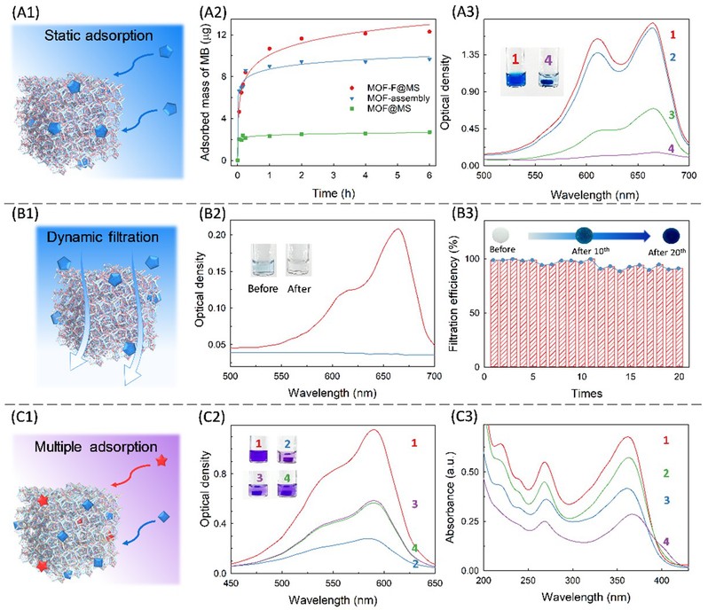 多孔材料在农业、能源、环境、化工等诸多领域有重要应用价值。特别地,多孔材料已发展成为农业有害和信息分子的快速、高效富集与检测平台。随着孔尺寸从(亚)毫米到(亚)纳米变化,多孔材料的特点、功能和应用场景大不相同。(亚)毫米孔径的宏观多孔材料(如海绵、泡沫等,简称宏观材料)机械性能好、传质快、便于操作,但孔过大既降低体比表面积,又限制了对其内部空间的充分利用;(亚)纳米孔径的微纳米材料(如金属-有机框架(MOFs)、多孔石墨烯等,简称纳米材料)具有比表面积高、活性位点多等特点,但常见以颗粒/粉末形式存在,限制了其进一步的实际应用。显然,上述两类材料优势互补,将两者结合于一体构建分级多孔材料有望充分发挥多孔材料的特点,实现性能最大化。然而,合适的集成策略和结构一直是解决该难题的瓶颈。