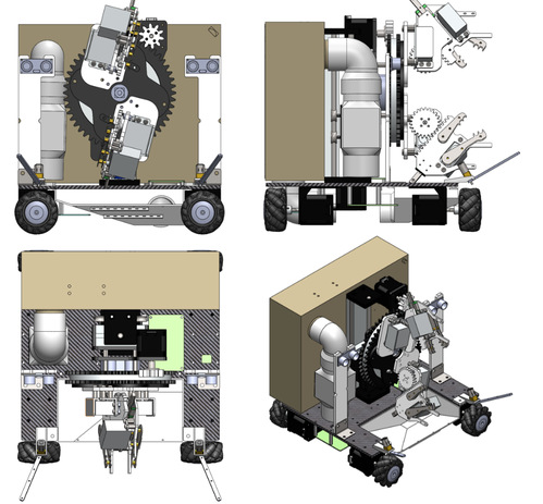 正面的四个金属钻头手爪是标准组Dawn and Darkness队机器人的核心部件,凭借优秀的采摘效率和采摘鲁棒性(在工程和科学领域,鲁棒性指的是系统在面对不确定性、扰动或意外情况下的稳定性和可靠性),棉花机器人可以一并采摘各种形态的棉花;同时,机器人上安装的红外传感器和超声波传感器保证了与棉花所在垄的平行度,使棉花的收集又快又稳。最终,队伍在棉花收集量这一指标上,以48.7g的成绩夺得第一,是标准组所有队伍棉花收集量平均值的3倍多。