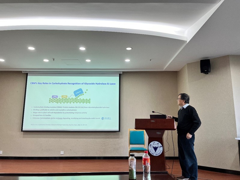 柴文刚教授以糖链结构解析为例,介绍了伦敦帝国学院医学院的糖科学研究室如何用质谱与糖芯片为主要手段,了解蛋白与不同食品来源的糖分子相互作用的特异性。而后,参会同学们针对感兴趣的话题与柴文刚教授展开交流。
