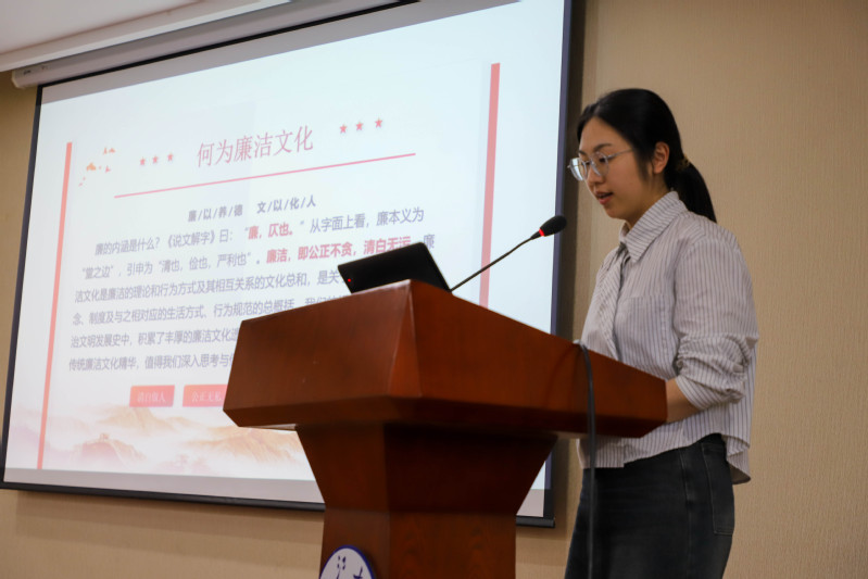 他们结合典型案例,弘扬廉洁精神。黄俏分享了古代杨震、张伯行,以及现代焦裕禄、张桂梅的廉洁模范事迹,呼吁青年学子要克己奉公、清廉自守。金利从东汉名臣刘宠家无货积、替百姓办实事的故事到廉洁精神在生活中如何实践,强调要以史为镜,用行动来弘扬廉洁文化。崔蕊艳从大学生不廉洁行为的心理因素出发,分析其与贪官腐败行为的相似性,警示广大青年要抵住诱惑,崇廉尚洁,树立正确的价值观和人生观。