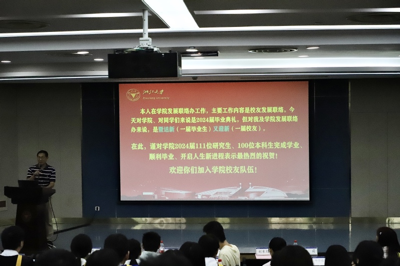 学院毕业典礼结束后,学院发展联络办主任、浙江大学校友总会生工食品学院分会秘书长邹黎明为2024届毕业生作了关于校友联络工作的专题讲座,向新毕业生、新校友们介绍了浙江大学校友总会及生工食品学院校友分会的历史沿革,校友总会、各学院分会及各地方浙江大学校友会服务校友、服务母校、服务社会的校友会宗旨及加快构建更高质量的学校、学院-校友发展共同体的校友会工作目标,学校、学院校友情况,校友总会及校友分会各机构组织与校友联络平台情况,“缘定浙大”校友集体婚礼、校友创新创业大赛、校友讲堂、全球浙大校友行校友企业专场招聘会、大学之声·新年音乐会、校友书画展、秩年返校校友接待等校友活动,电子校友卡申领、服务校友进校、图书馆预约进馆、浙大校友微信公众号等校友服务与校友活动信息发布情况,以及学院服务校友、服务社会情况,并向新校友们介绍了电子校友卡申领、服务校友驾车进校等流程。