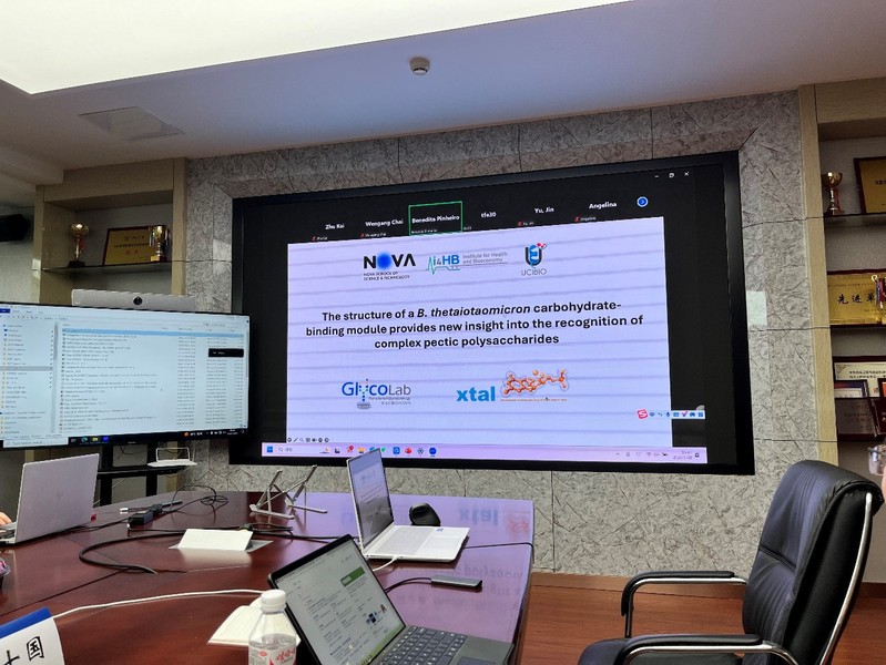 Liu高级研究员介绍了伦敦帝国学院医学院的糖科学研究室如何用质谱与糖芯片为主要手段,精确定位病原体的聚糖配体,为设计治疗性抑制化合物开辟了新途径。NOVA大学Benedita Pinheiro助理研究员介绍了将X射线晶体学与聚糖糖芯片分析技术相结合,揭示了来自瘤胃和人类肠道菌群的碳水化合物相互作用蛋白与果胶等多种多糖的独特选择性结合机制,以期发现新的聚糖识别系统,并在分子水平上了解蛋白质-聚糖相互作用。