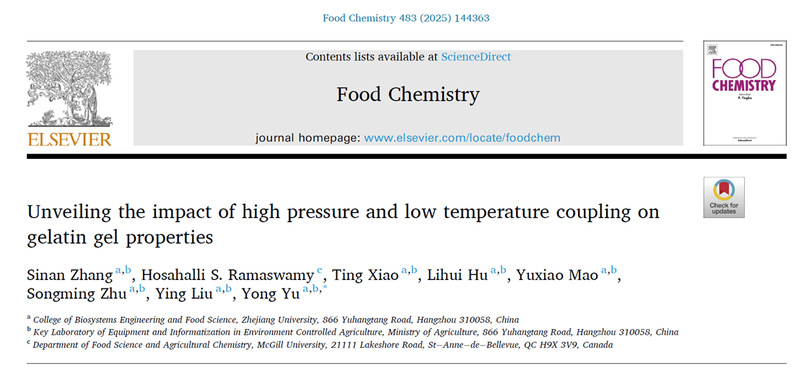近日,浙江大学生工食品学院于勇副教授团队联合McGill大学食品科学与农业化学系Hosahalli S. Ramaswamy院士团队在国际食品Top期刊《Food Chemistry》上发表论文“Unveiling the impact of high pressure and low temperature coupling on gelatin gel properties”。