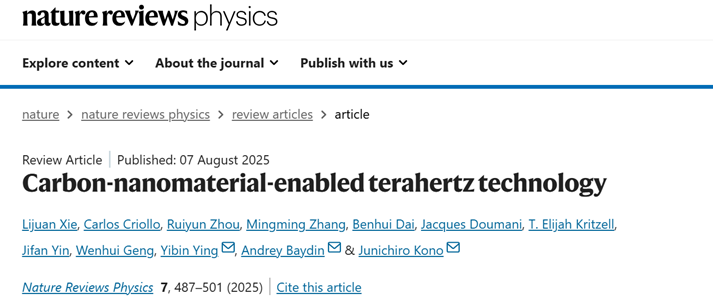 浙江大学智能生物产业装备创新团队(IBE)谢丽娟教授、应义斌教授联合美国莱斯大学Junichiro Kono教授团队,应邀在国际权威综述期刊Nature Reviews Physics(2024年影响因子:39.5)上发表题为“Carbon-nanomaterial-enabled terahertz technology”的综述论文。文章系统总结了碳纳米材料在太赫兹(Terahertz, THz)技术领域的最新研究进展,并重点介绍了IBE团队在该方向上的代表性成果,为下一代THz器件的开发提供了重要理论参考。