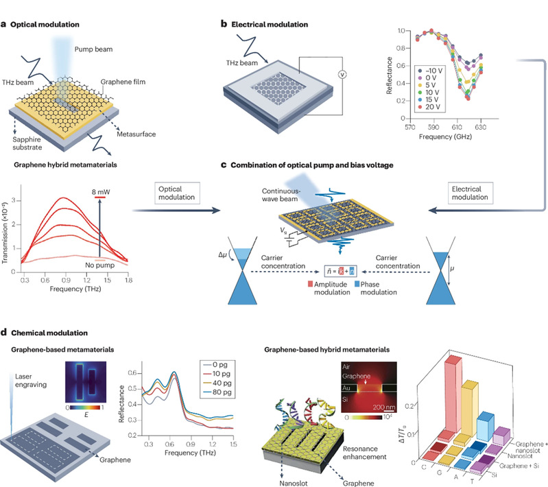 在THz调制方面,碳纳米材料可通过光激发、电场、应变和化学掺杂等多种外部刺激实现THz波的动态调控。石墨烯基超表面结合高掺杂石墨烯和THz纳米缝隙天线,在光泵浦下实现了80%的调制深度和1.83 ps的快速载流子衰减时间。通过电压调控费米能级,石墨烯调制器实现了100%的调制深度和超过100 MHz的调制速度。