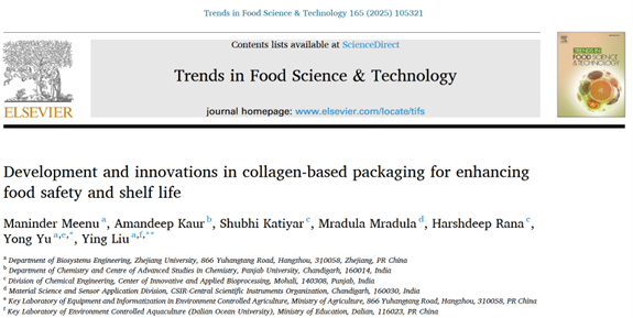 近日,浙江大学生工食品学院刘鹰教授、于勇副教授团队联合大连海洋大学、印度旁遮普大学(Panjab University)、印度创新与应用生物加工中心(Center of Innovative and Applied Bioprocessing)、印度中央科学仪器研究所(CSIR-Central Scientific Instruments Organization)等多家国内外科研单位,在国际食品科学领域Top期刊《Trends in Food Science & Technology》(Q1,IF2024=15.4)上发表了题为“Development and innovations in collagen-based packaging for enhancing food safety and shelf life”的综述论文。