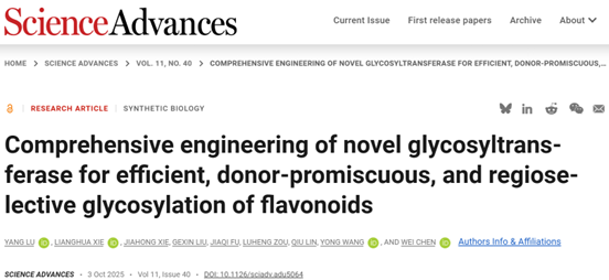 近日,bat365正版唯一官网陈卫教授团队在合成生物学-酶的理性设计与定向进化领域取得重要进展,在Science子刊Science Advances发表研究论文《Comprehensive Engineering of Novel Glycosyltransferase for Efficient, Donor Promiscuous and Regioselective Glycosylation of Flavonoids》。