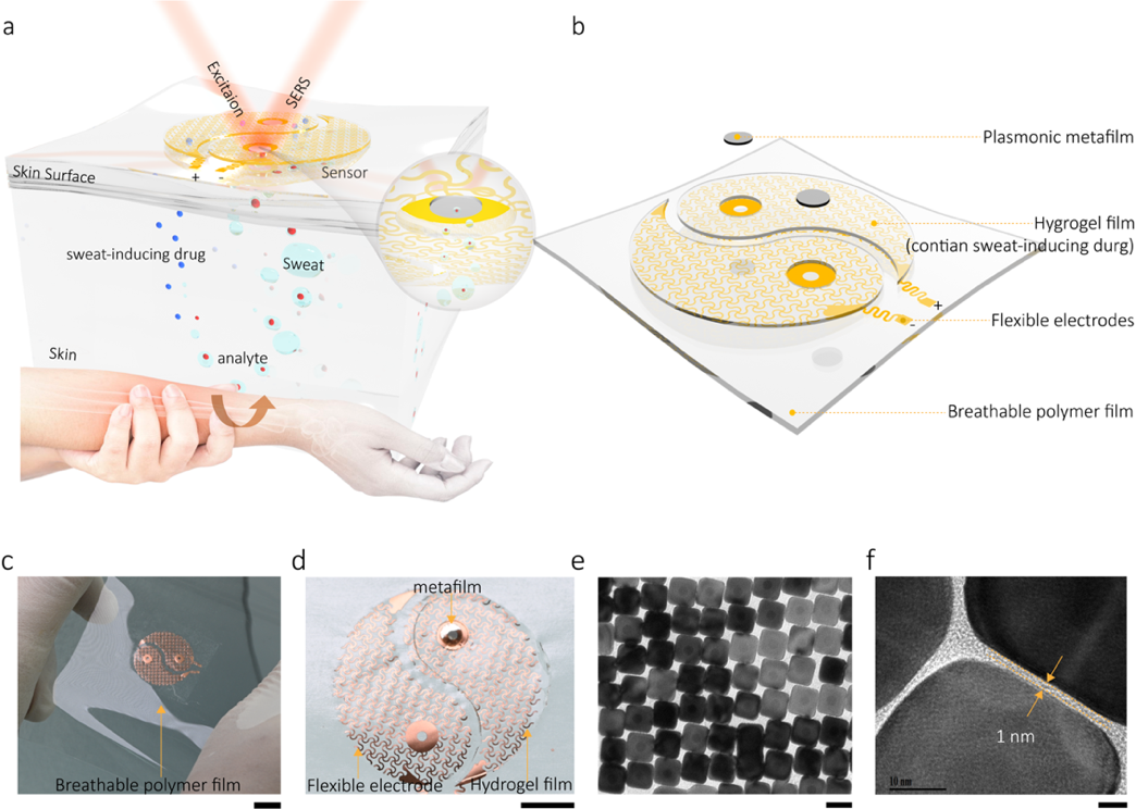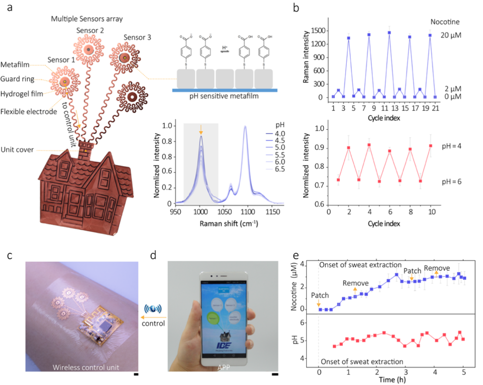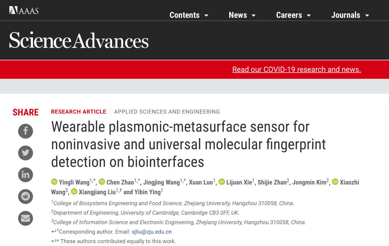 Recently, Professor Liu Xiangjiang, IBE of Zhejiang University, published a research paper entitled "Wearable plasmonic-metasurface sensor for noninvasive and universal molecular fingerprint detection on biointerfaces" in the Science Advances. In this paper, a new type of flexible optical sensor is reported for the first time, which can realize the non-destructive, real-time and on-line monitoring of multi-target molecules in organisms, and fill the blank of the existing wearable sensing technology.