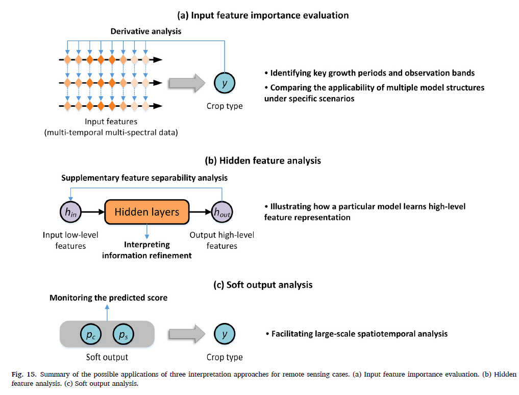 Multi-temporal deep learning approaches have exhibited excellentclassification performance in large-scale crop mapping. These approachesefficiently and automatically transform remote sensing time series into high-dimensionalfeature representations to identify crop types. The lack of interpretation,however, is regarded as a major drawback of these high-performance approaches.Interpreting deep learning approaches in multitemporal crop mapping is criticalfor verifying their reliability. This study aims to quantify the impact of multi-temporalinformation in input time series on classification performance and develop amulti-perspective interpretation pipeline for deep learning models. Thepipeline involves three interpretation approaches: evaluating input featureimportance, analyzing hidden features, and monitoring temporal changes inmodel's soft output. An experiment is conducted to classify corn and soybean inthe U.S corn belt in 2018. The study area consists of three sites each encompassingmillions of pixel-level samples at 30 m resolution. The Landsat Analysis ReadyData are used as the input remote sensing time series and Cropland Data Layeris used as the ground reference. Attention-based Long Short-Term Memory(AtLSTM) and Transformer models are built as multitemporal deep learningmodels, and compared to Random Forest (RF). Complete time series input in thecorrect order achieves a higher overall accuracy of 97.8% than usingsingle-window or out-of-order inputs, indicating multi-temporal informationfacilitates crop classification. An assessment of the input feature importance demonstratesthat the AtLSTM, Transformer, and RF models all consider the period from weeks11 to 20 (early- July to late-August) as a key growth period and the shortwaveinfrared band as the critical band for corn and soybean discrimination. Hiddenfeature analysis suggests that the AtLSTM model accumulates the usefulinformation over the growth period, while the Transformer model extracts thetemporal dependencies that contribute important information to high-levelfeature learning. The learned features contain more effective and refined informationthan the raw input features and thus are better suited for crop classification.The soft output analysis in the in-season classification scenario demonstratesthat increased length of input time series improves the model's confidence inthe classification results. The further comparison of input feature importancein different sites and years demonstrates the applicability of theinterpretation approach at larger spatiotemporal extents with heterogeneouslandscapes and interannual variability. This study provides a multi-perspectiveevaluation to identify key features in multi-spectral and multi-temporal remotesensing data, and yields a practical approach to integrate agronomy knowledgein deep learning-based crop mapping.